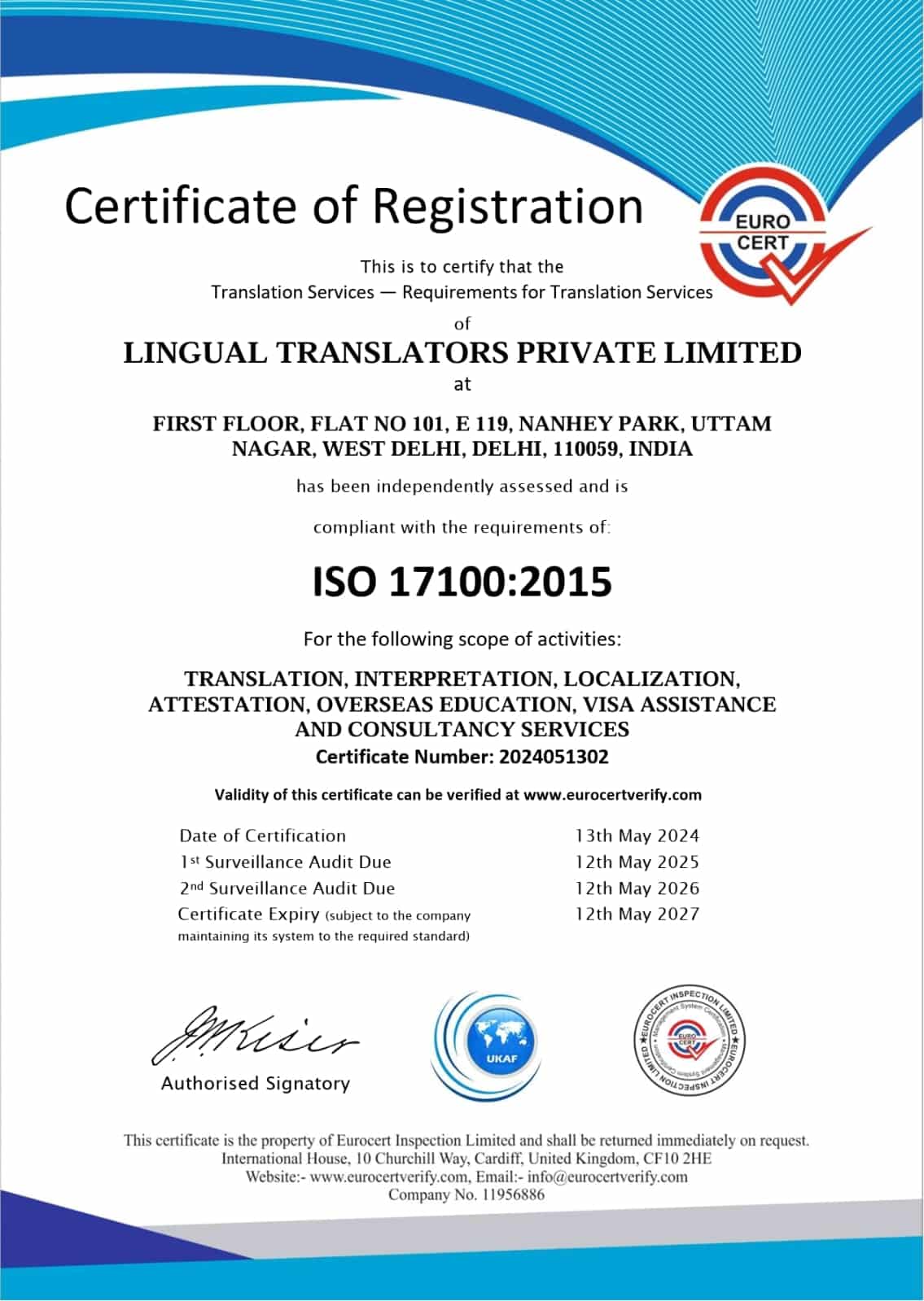 Since 2005, Lingual Translators Pvt Ltd is operational, it is a Government‑of‑India registered language services provider and ISO 17100:2015 certified company specializing in translation, interpretation, attestation, and visa assistance services.